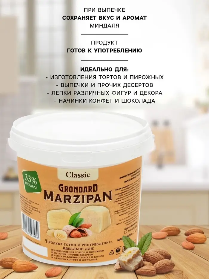 Большой, сладкий и необычный подарок для детей и взрослых. Целый килограмм свежего марципана в ведерке! Обладает ярко выраженной ореховой текстурой и настоящим ароматом миндаля. Марципановая масса оптимальна для кондитерских продуктов: начинок, покрытия и слоев, тортов, конфет и где необходимо снизить сладость продукта. За счёт высокой доли миндаля 33% сохраняет все полезные свойства ореха. Приятный, не приторный вкус - прекрасно сочетается с несладким чаем и кофе.