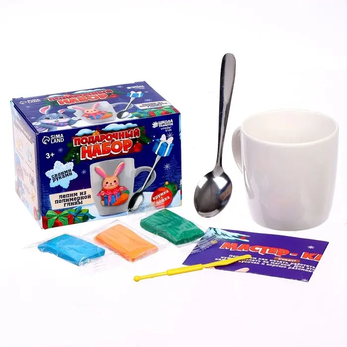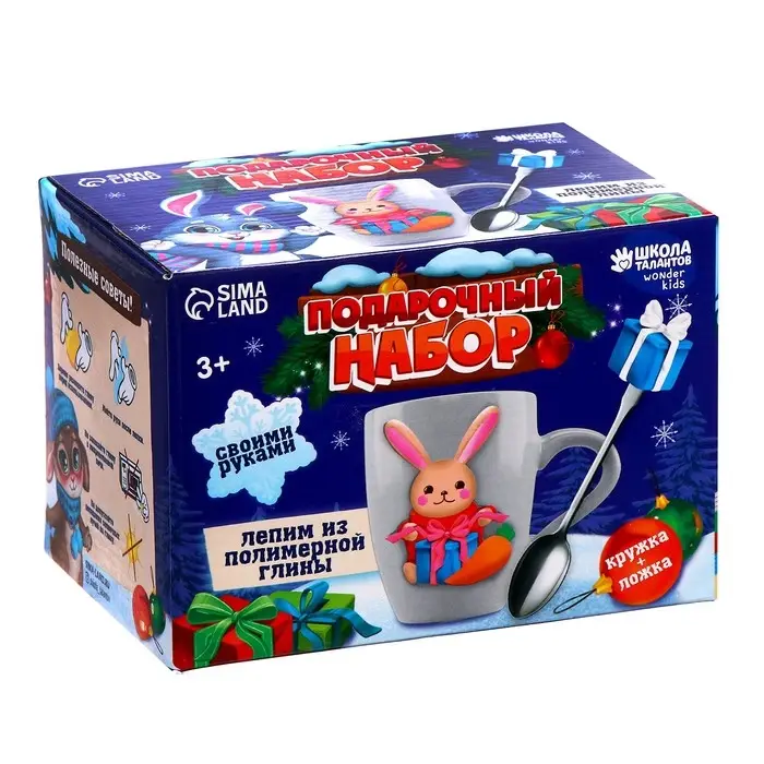 Декор кружки и ложки полимерной глиной на новый год «Зайка и подарок», набор для творчества
