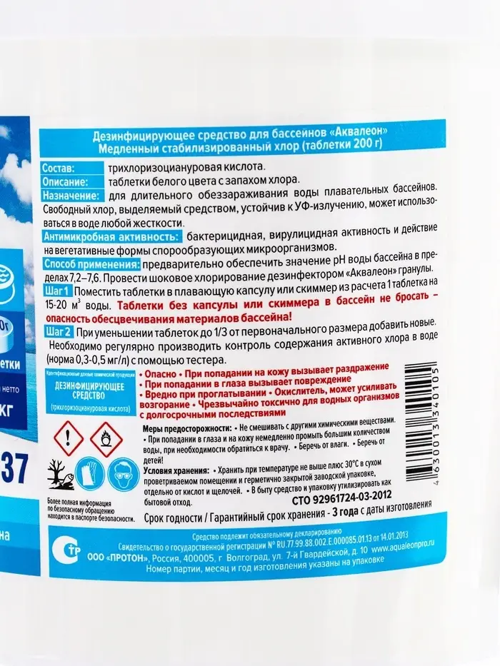 Способ применения: перед использованием дезинфицирующего средства обеспечьте значение рН воды бассейна в пределах 7,2–7,6. Необходимое количество таблеток поместите в плавающую капсулу или в скиммер. При интенсивном использовании бассейна дозировку допускается увеличивать в соответствии с показаниями тестера хлора. При этом необходимо постоянно производить контроль и корректировку в воде содержания активного хлора и циануровой кислоты.