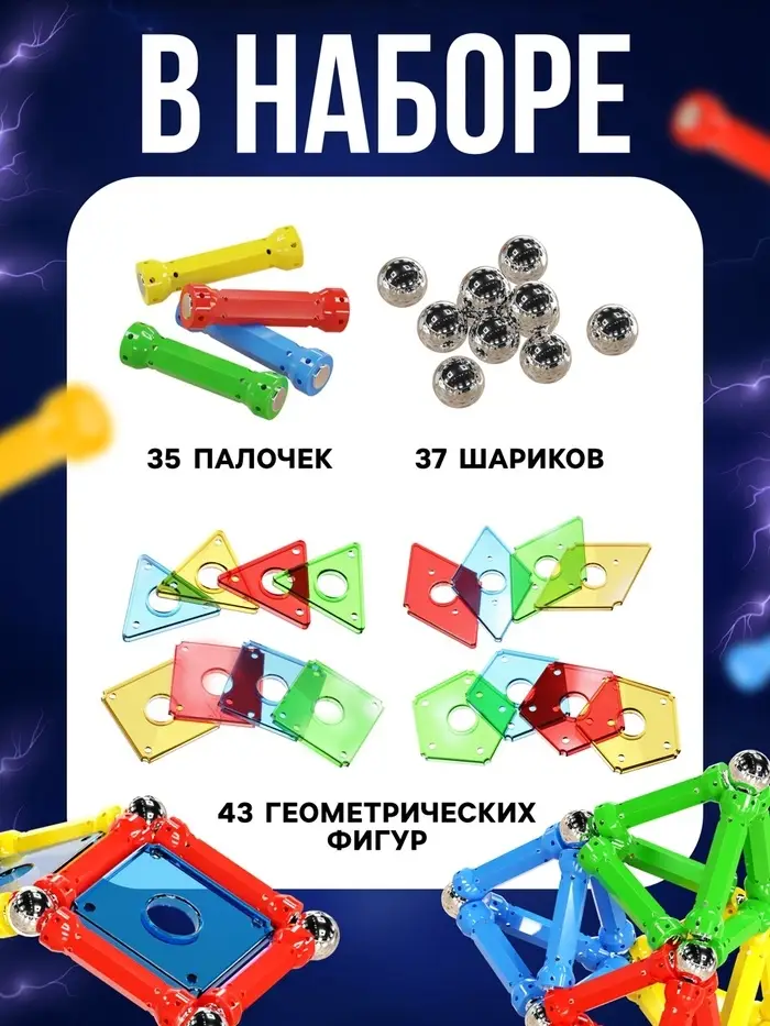 В наборе вы найдёте магнитные палочки, металлические шарики и дополнительные элементы для конструирования.