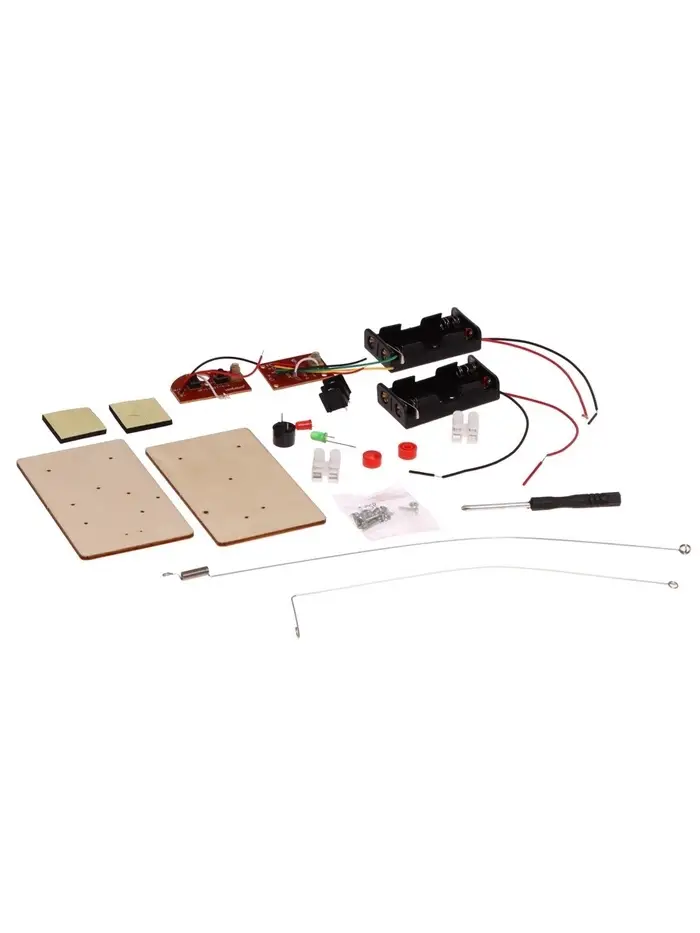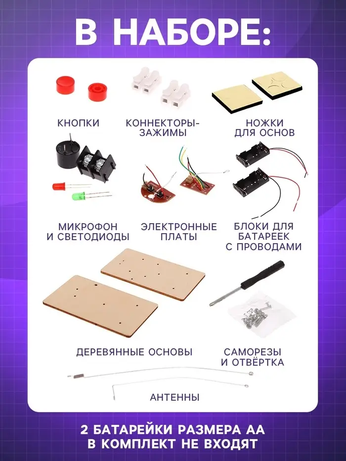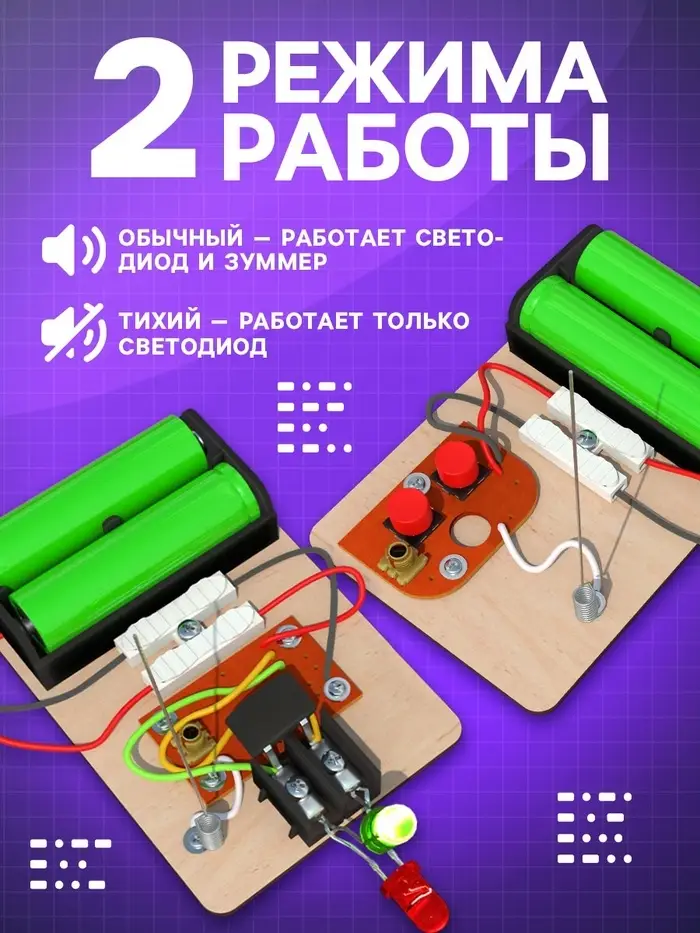 - В электронном конструкторе необходимо использовать батарейки 1,5 В. Такое напряжение безопасно для человека. Поэтому ребёнок сможет самостоятельно играть с набором, а вы — не переживать о его безопасности.