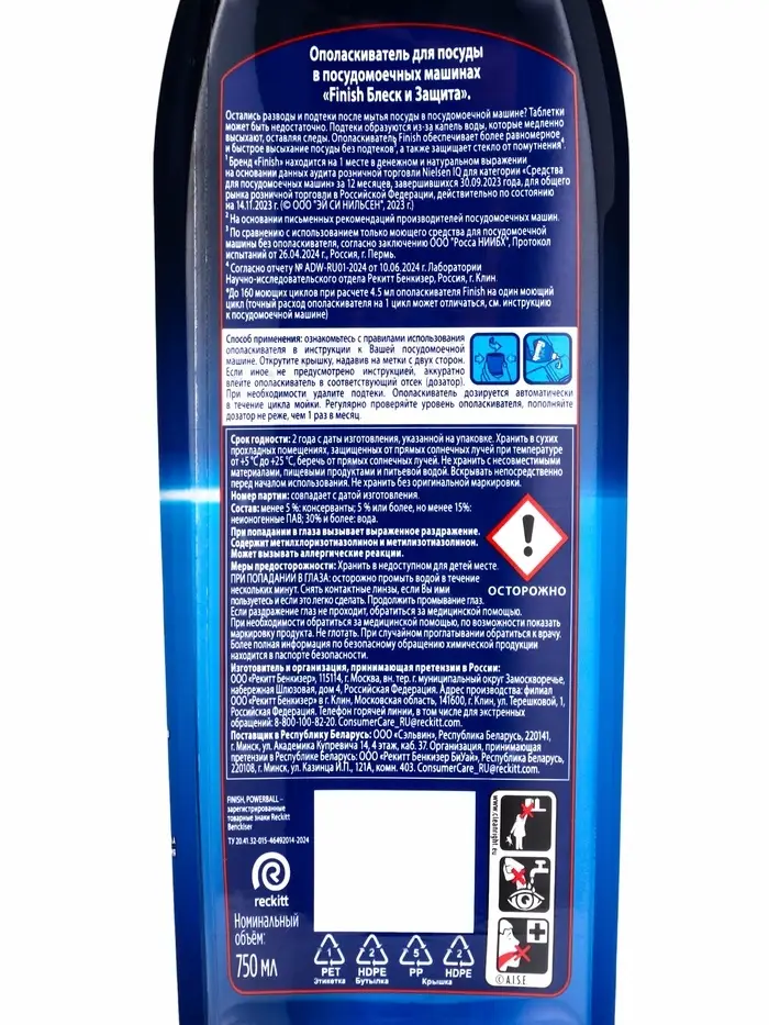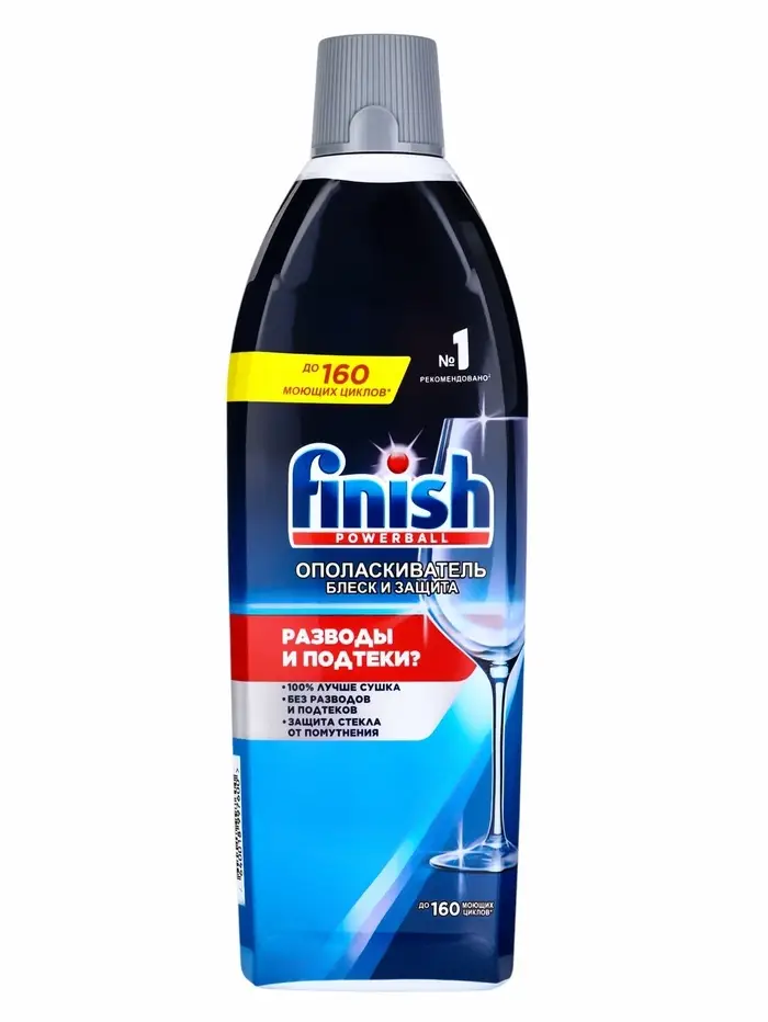 Остались разводы и подтеки после мытья посуды в посудомоечной машине? Таблетки может быть недостаточно. Подтеки образуются из-за капель воды, которые медленно высыхают, оставляя следы. Для борьбы с этой проблемой и ускорения процесса сушки рекомендуем добавлять ополаскиватель для осудомоечных машин Finish Shine & Protect (Сияние & Защита). Ополаскиватель Finish поможет избавиться от подтеков и разводов, а также придать ослепительный блеск вашей посуде. Кроме того, упаковка Finish Shine & Protect полностью перерабатываемая и на 35% состоит из переработанного пластика. Ополаскиватель Finish Shine & Protect работает на финальном этапе цикла мойки, его формула обеспечивает дополнительную защиту от помутнения (коррозии) стекла и придает ослепительное сияние вашим стаканам и бокалам. Мы рекомендуем, чтобы отсек с ополаскивателем всегда был заполнен. Проверяйте и добавляйте ополаскиватель один раз в месяц или при мигании соответствующего индикатора на внешней панеле посудомоечной машины, который указывает на низкий уровень средства.