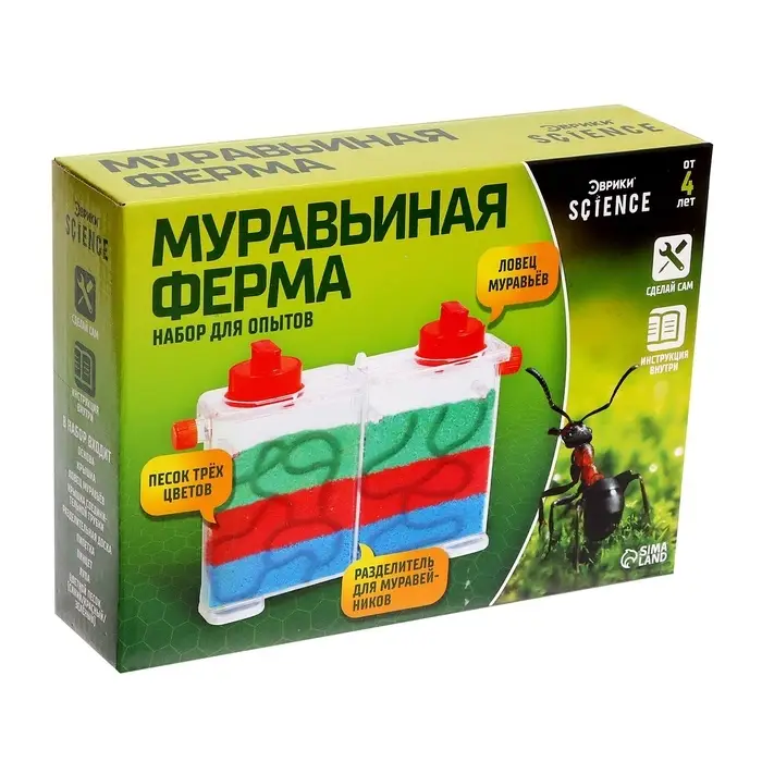 С набором для опытов «Муравьиная ферма» ребёнок создаст домик для небольшой муравьиной колонии. Малыш сможет наблюдать через абсолютно прозрачную поверхность контейнера, как насекомые питаются и как будет протекать процесс роста семьи!