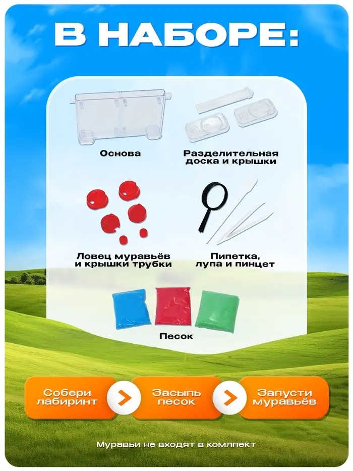 - Муравьи любят рыться в песке и исследовать разные места, для этого в комплекте есть 3 вида цветного песка.