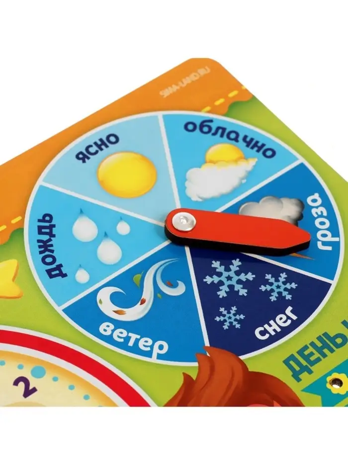 - Простой и понятный дизайн помогает ребёнку изучать времена года, месяцы, дни недели, время суток и даже погоду.