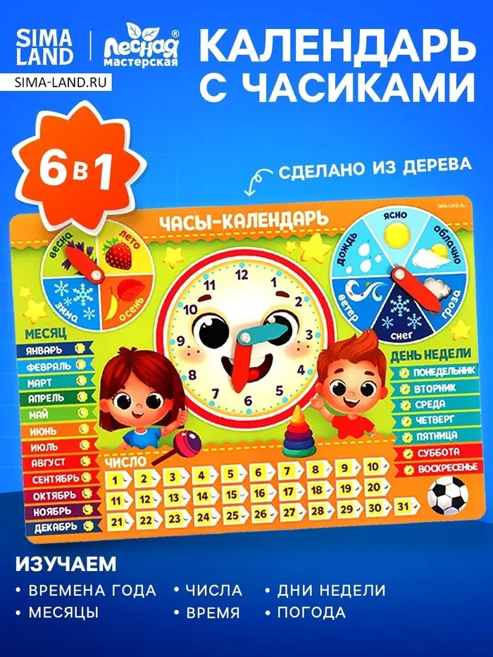 Деревянная развивающая игра «Часы-календарь. Ребята» — это увлекательный инструмент для детей от 3 лет, который помогает освоить понятия времени, дней недели, месяцев и сезонов. Она сочетает обучение с игрой, делая процесс познания мира лёгким и интересным.