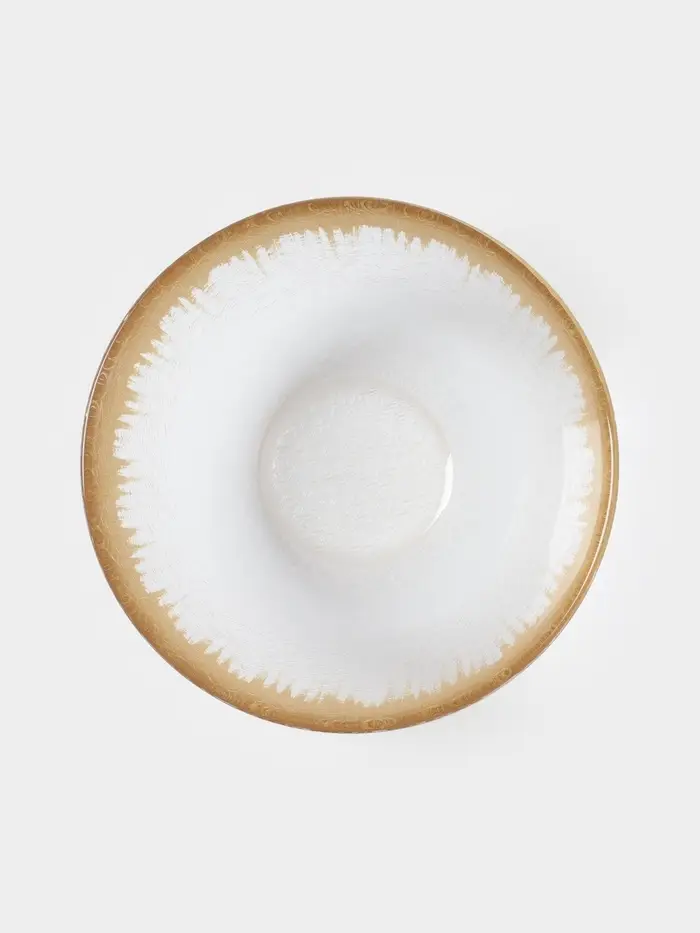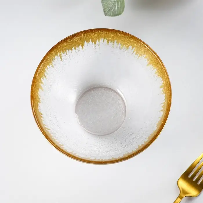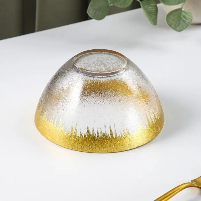 Стеклянный салатник станет ярким акцентом в любой сервировке. Золотистый оттенок придает изделию праздничный вид, но при этом сохраняет универсальность в использовании.