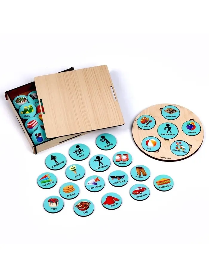 Разложите перед ребёнком все карточки, определите, что изображено на каждой, проговорите это вместе. Теперь покажите малышу пример построения предложения с помощью фишек. Затем попросите его сделать то же самое.