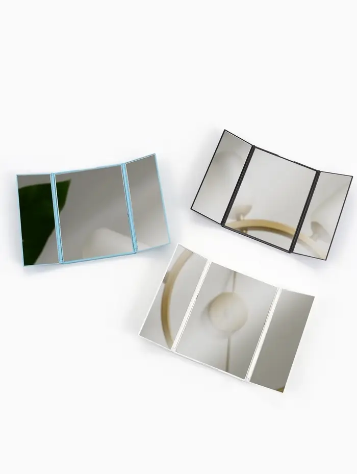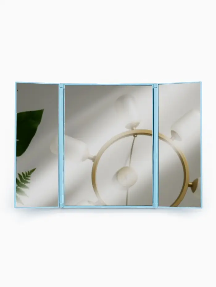 Компактное настольное складное зеркало с тремя прямоугольными стеклянными панелями и разноцветной рамой станет удобным аксессуаром для дома. Размеры зеркал 5×15 см и 11×15 см обеспечивают широкий обзор без увеличения, а пластиковый корпус облегчает переноску и размещение на столе в спальне, ванной или прихожей.