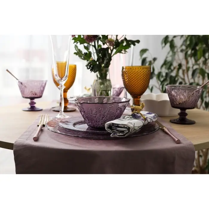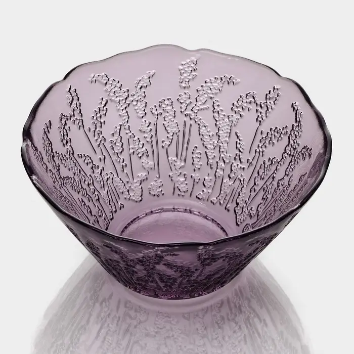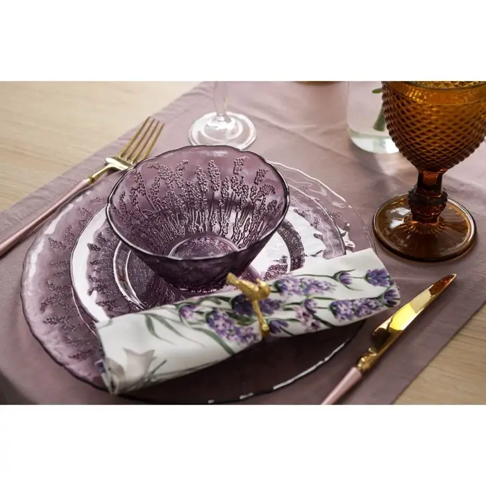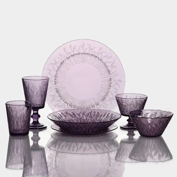 Предметы серии «Французская лаванда» изготовлены из качественного прочного стекла и имеют красивый рельеф в виде лавандовых веточек. Посуда имеет приятный фиолетовый оттенок и будет хорошо смотреться как в праздничной, так и в повседневной сервировке.
