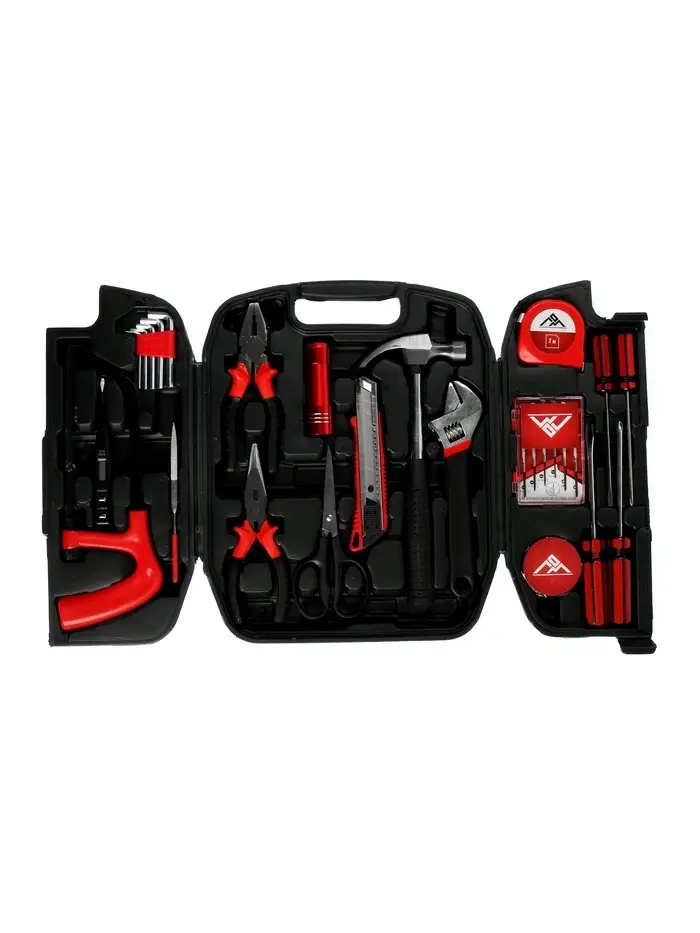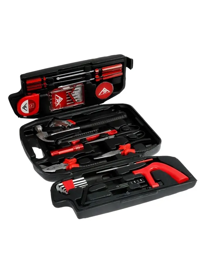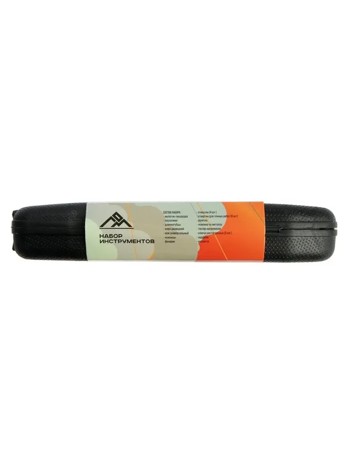 Комплект включает плоскогубцы, разводной ключ, тестер, шестигранные ключи, рулетку, длинногубцы, ножницы и фонарь, что делает его практичным решением для множества бытовых ситуаций.