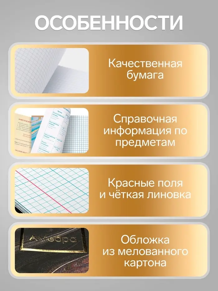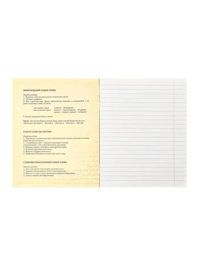 Справочные страницы в начале тетради помогут быстро вспомнить ключевые правила и формулы. Мягкая обложка и надёжное скрепление скобами делают тетради долговечными. Начните учебный год с готовым комплектом, где для каждого предмета есть своя тетрадь.