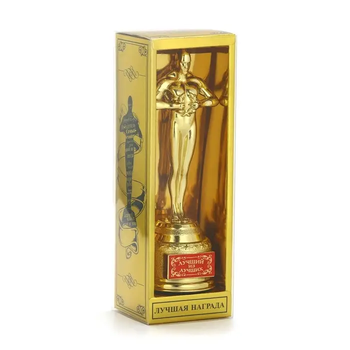 Золотистая фигура «Оскар» с лавровым венком в руках дополнена пластиковой подставкой. На постаменте есть яркий голографический шильд со званием получателя награды.