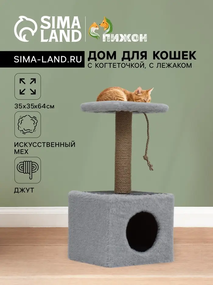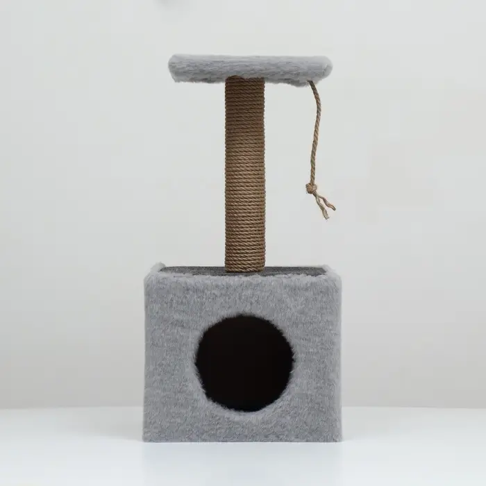 Домик для животных с когтеточкой, 32×32×64 см, с полкой, джут, серый