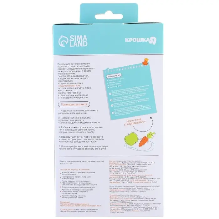 Многоразовые пауч пакеты для детского питания, с ложкой, 200 мл, набор 10 шт., Крошка Я