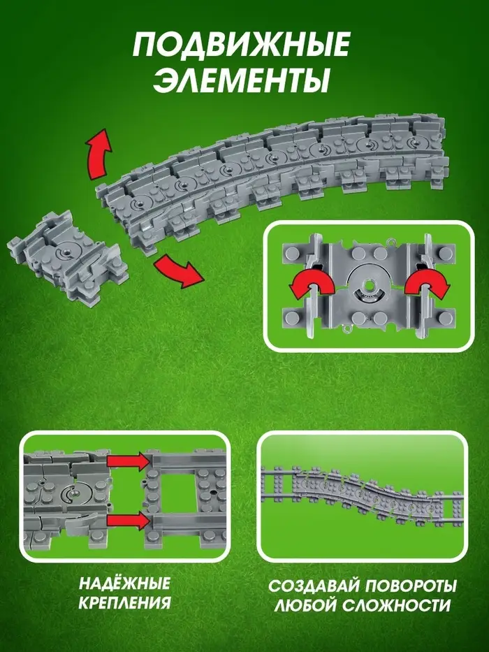 - Совместимость с популярными брендами: рельсы и крепления подходят для соединения с другими железнодорожными наборами. Можно расширять дорогу, добавляя новые элементы.