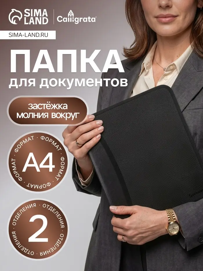 Папка на молнии Calligrata предназначена для переноски документов, а также их хранения. Незаменима в работе и учебе, в командировках, деловых поездках, путешествиях. Изготовлена из прочного черного полипропилена толщиной 0,9 мм с фактурой "бисер". Формат А4 (350х282 мм). Имеет два внутренних отделения и четыре кармана. Надежный замок-молния защищает документы от механических повреждений, а также пыли и влаги. Цвет молнии - черный. Важные документы и ценные бумаги всегда требуют повышенного внимания и деликатного обращения. Их безопасность и опрятный внешний вид обеспечит папка Calligrata. Организовать деятельность сотрудников, нацеленную на высокий результат, помогут товары нашего интернет-магазина!