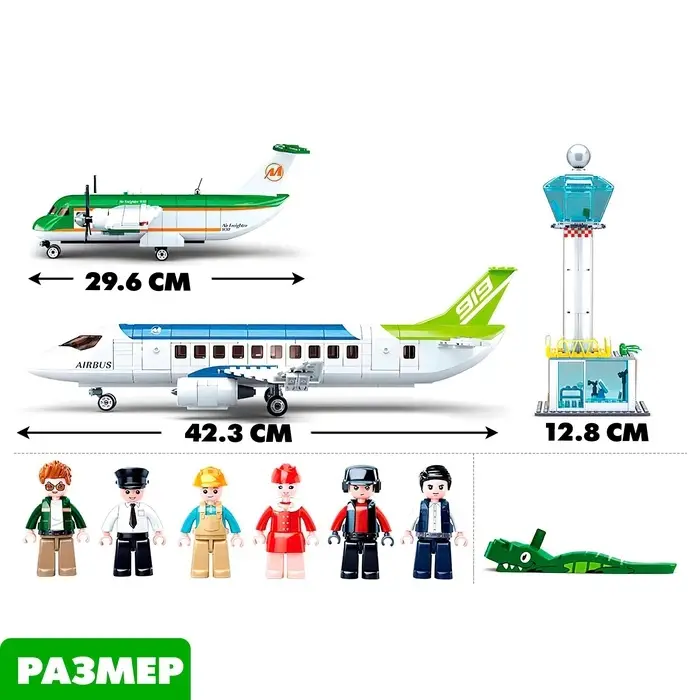 В конструкторе «Авиация. Аэропорт» 731 деталь, из которых ребёнок соберёт 2 самолёта — пассажирский и грузовой, а также вышку авиадиспетчера и контрольный пункт.