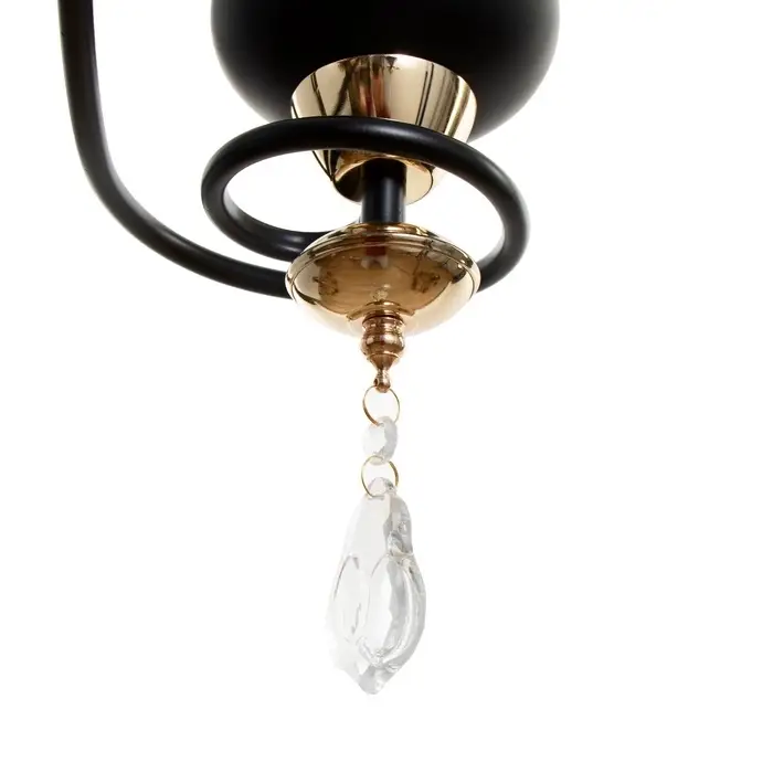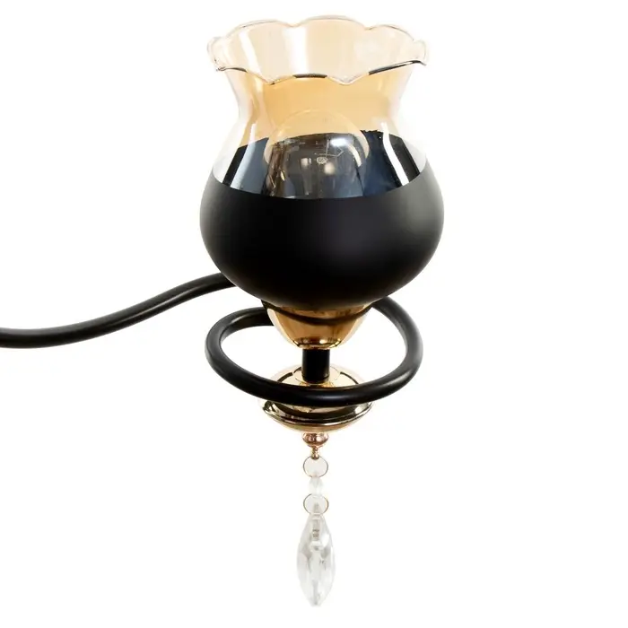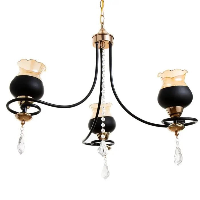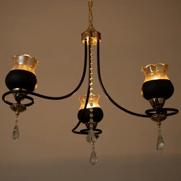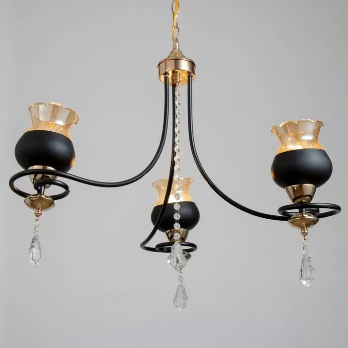 - Выразительный дизайн: Три стеклянных абажура в форме цветов создают мягкое рассеянное освещение. Черное основание с золотыми акцентами добавляет интерьеру глубины и контраста.