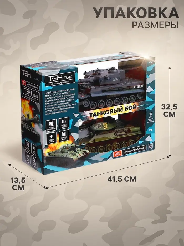 Танковый бой Т-34 vs Tiger — это набор из двух радиоуправляемых танков, которые могут бороться друг с другом. Каждый танк имеет уникальную раскраску и оснащён светом и звуком, чтобы сделать игру более захватывающей.