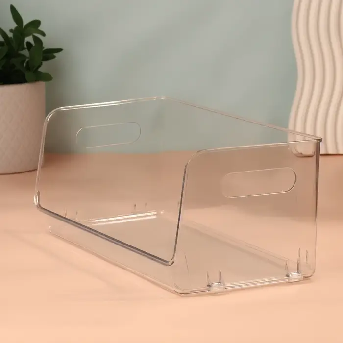 - Простота использования: прозрачный материал позволяет легко находить нужные вещи, а боковые ручки обеспечивают удобное перемещение.