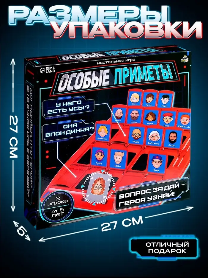 Проверьте интуицию с настольной игрой «Особые приметы»! Догадайтесь, какой персонаж у вашего соперника на уме. Догадались? Не расслабляйтесь — угадать один раз недостаточно, ведь для победы нужно обыграть соперника 5 раз!