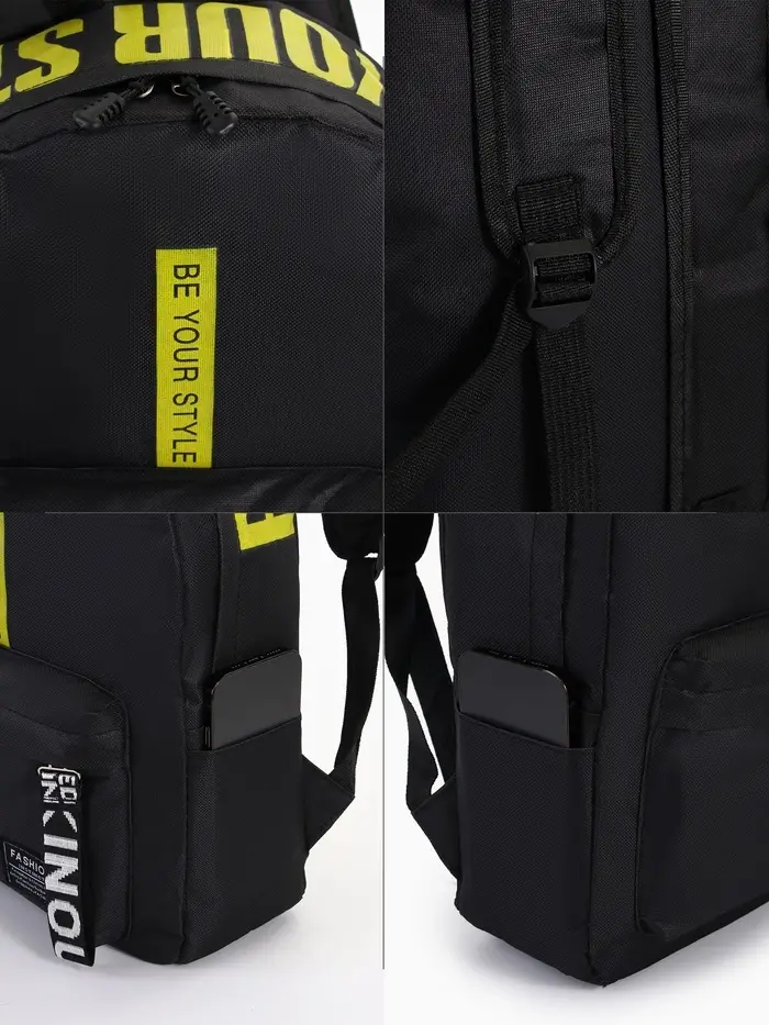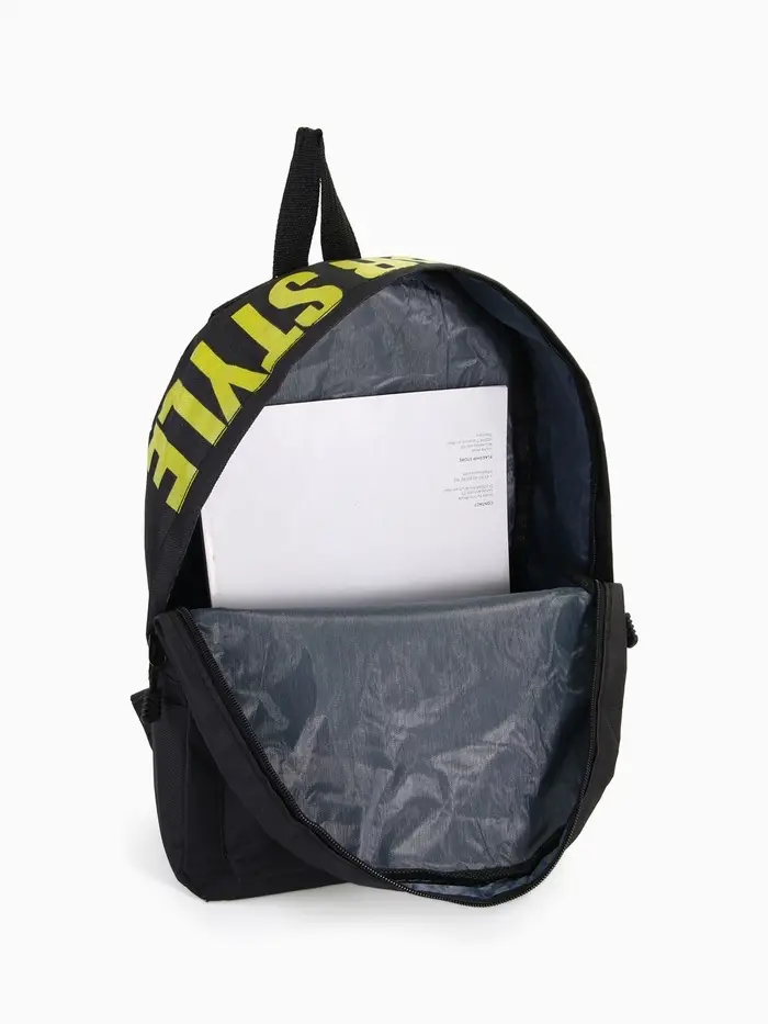 Этот чёрный рюкзак с яркими жёлтыми акцентами — универсальный спутник для школы, прогулок и путешествий. Его средний объём в 15-20 литров идеально подходит для учеников 5-11 классов и всех, кто ведёт активный образ жизни. Динамичный принт добавляет индивидуальности.