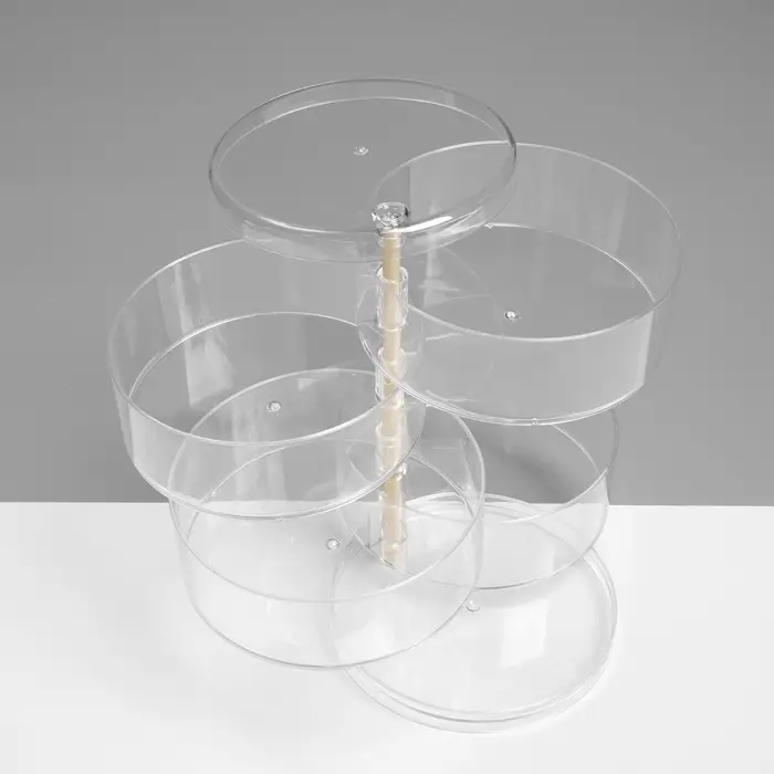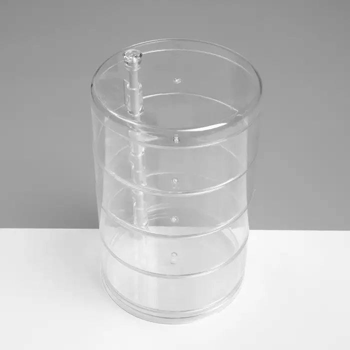 Прозрачная шкатулка с четырьмя секциями и цилиндрической формой размером 11,5×17,5 см — идеальный аксессуар для аккуратного и наглядного хранения украшений. Её лаконичный дизайн и универсальный материал делают её практичным решением для дома или рабочего пространства.