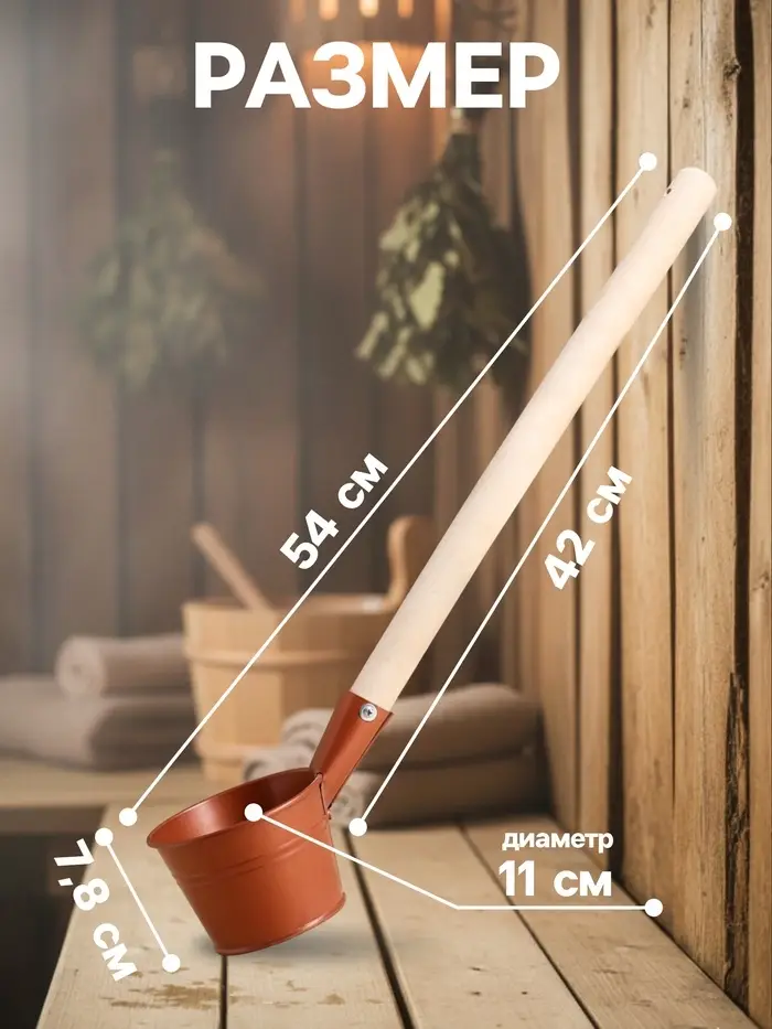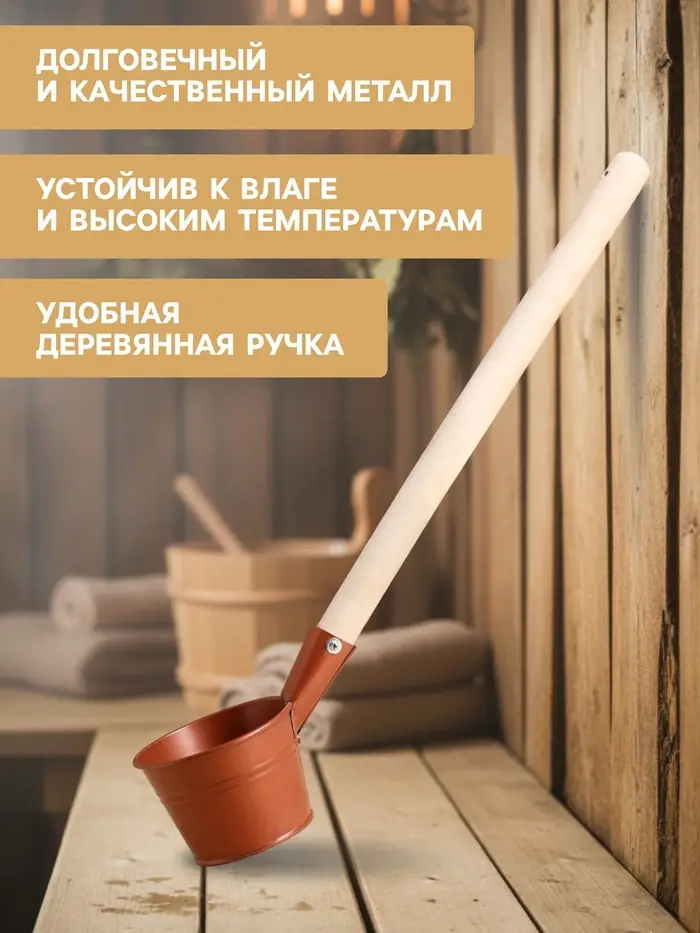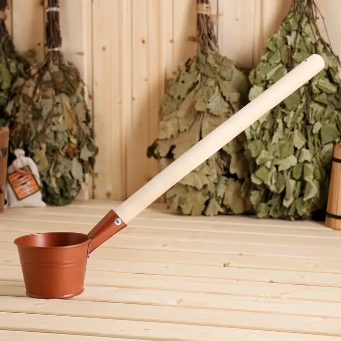 - Металлическая основа: Изготовлен из прочной стали, черпак гарантирует долгий срок службы. Покрытие цвета бронзы придаёт эффектный внешний вид, делая его не только функциональным, но и стильным аксессуаром для вашей бани.