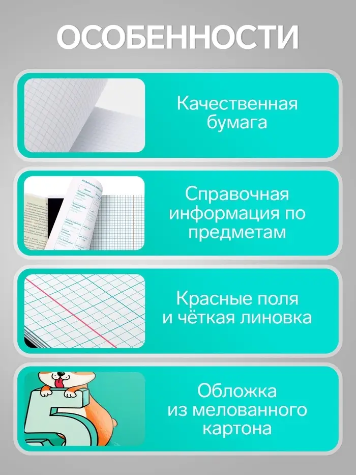 - Каждая тетрадь содержит справочные материалы по школьному предмету.