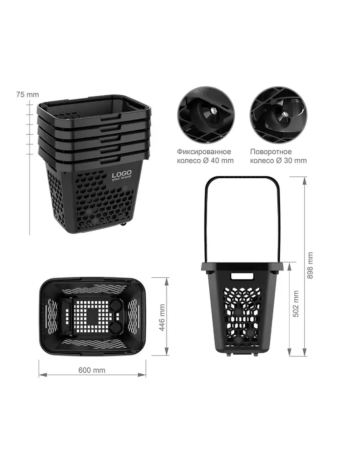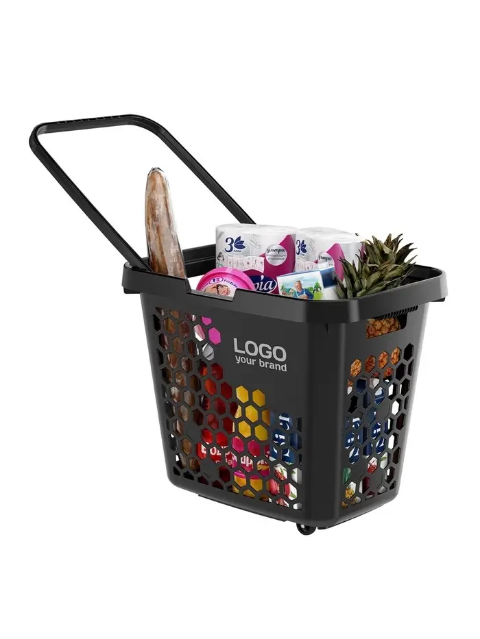 Небольшая корзина-тележка на 80 литров подойдёт для маленького торгового пространства. Благодаря удлинённой ручке и колёсикам с ней легко передвигаться по залу.