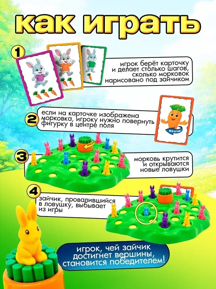 Шустрые зайчики спешат за морковкой. Помогите ушастым спортсменам взобраться на вершину зелёного холма. Будьте внимательны: на поле есть норки-ловушки — в любой момент ваш зайка может исчезнуть!
