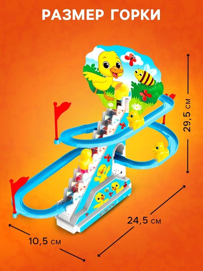 - Утята сами поднимаются по эскалатору и скатываются с горки.