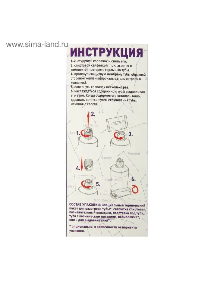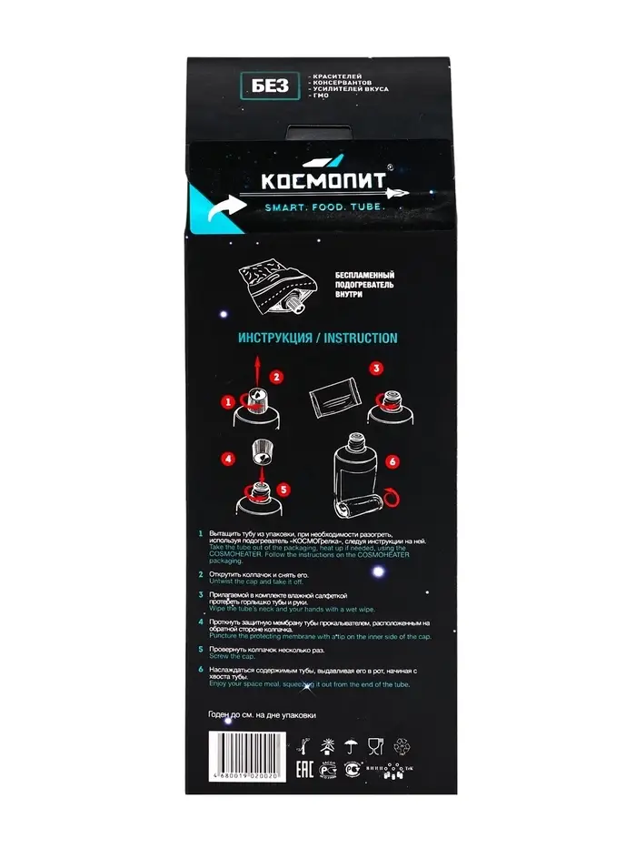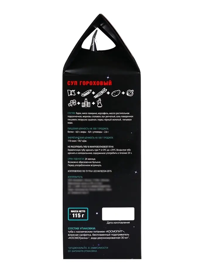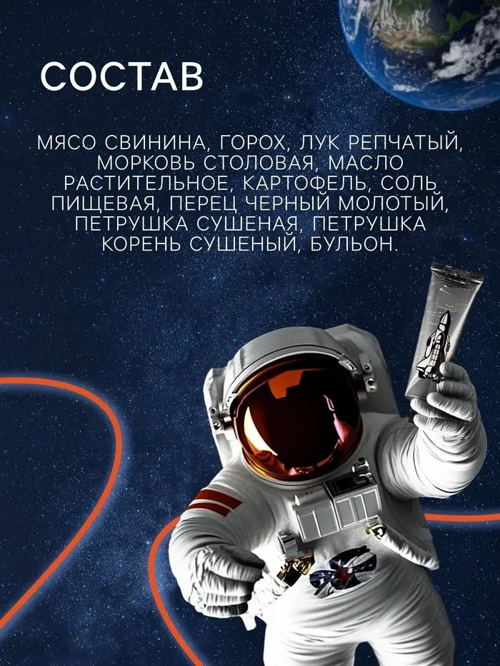 Состав экзотического блюда почти не отличается от привычного домашнего супа. Но сытный космический гороховый суп в компактном алюминиевом тюбике можно взять с собой куда угодно. Упаковка, в которую помещается 165 граммов еды, не боится коррозии и перепадов температуры. Она не требует холодильника. Даже если вы оставите тюбик на жаре, его герметичность не даст содержимому испортиться. И через год блюдо будет всё ещё готово к употреблению.