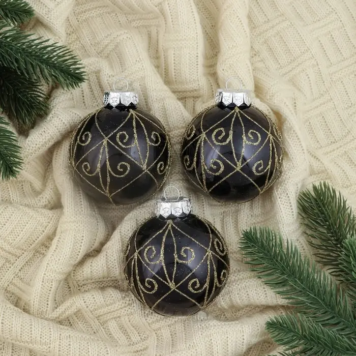 Набор ёлочных шаров в стиле ар-деко с изящным узорчатым декором станет изысканным дополнением праздничного интерьера. Три чёрно-золотистых шара диаметром 8 см создадут атмосферу торжественности и современного дизайна на вашей новогодней ёлке.