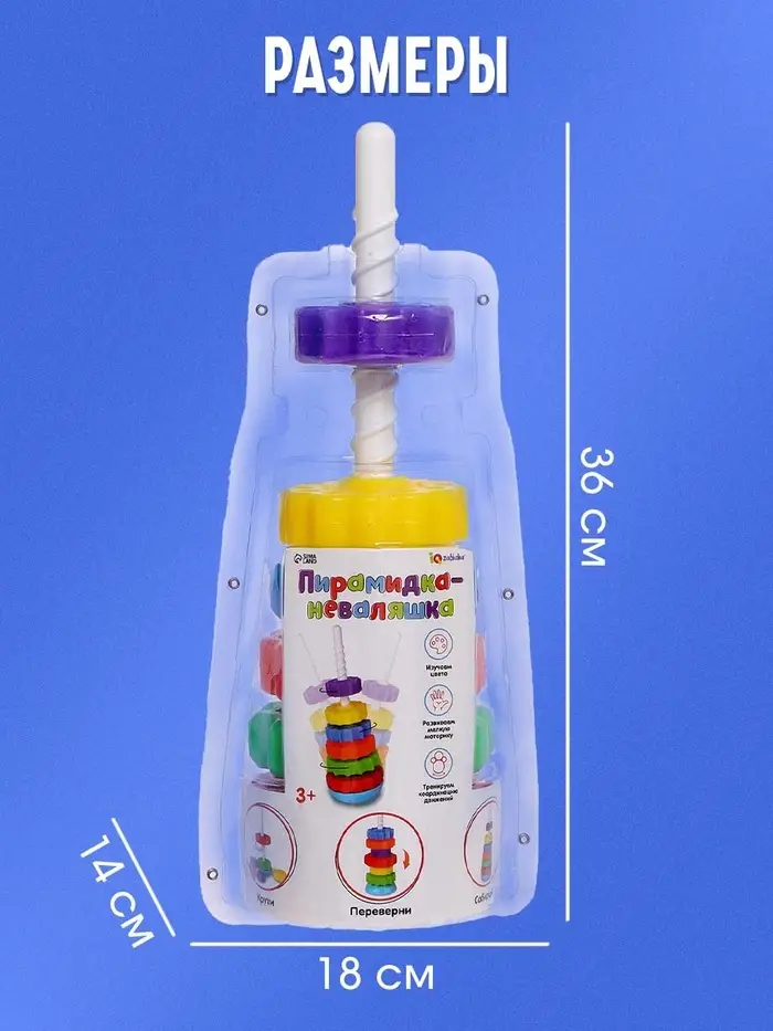 Пирамидка «Неваляшка» разработана специально для малышей от 3 лет. Игрушка состоит из шести ярких фигурок разных размеров, которые необходимо накручивать на особый винтовой стержень.