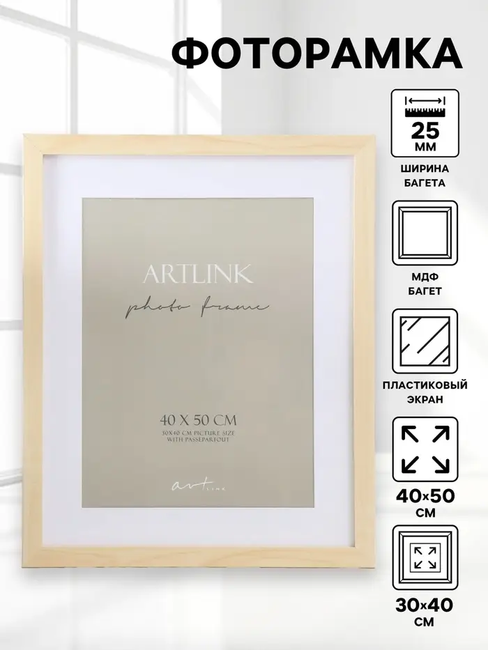 Фоторамка МДФ "Ellis" 40х50 см, с паспарту, натуральный (пластиковый экран)