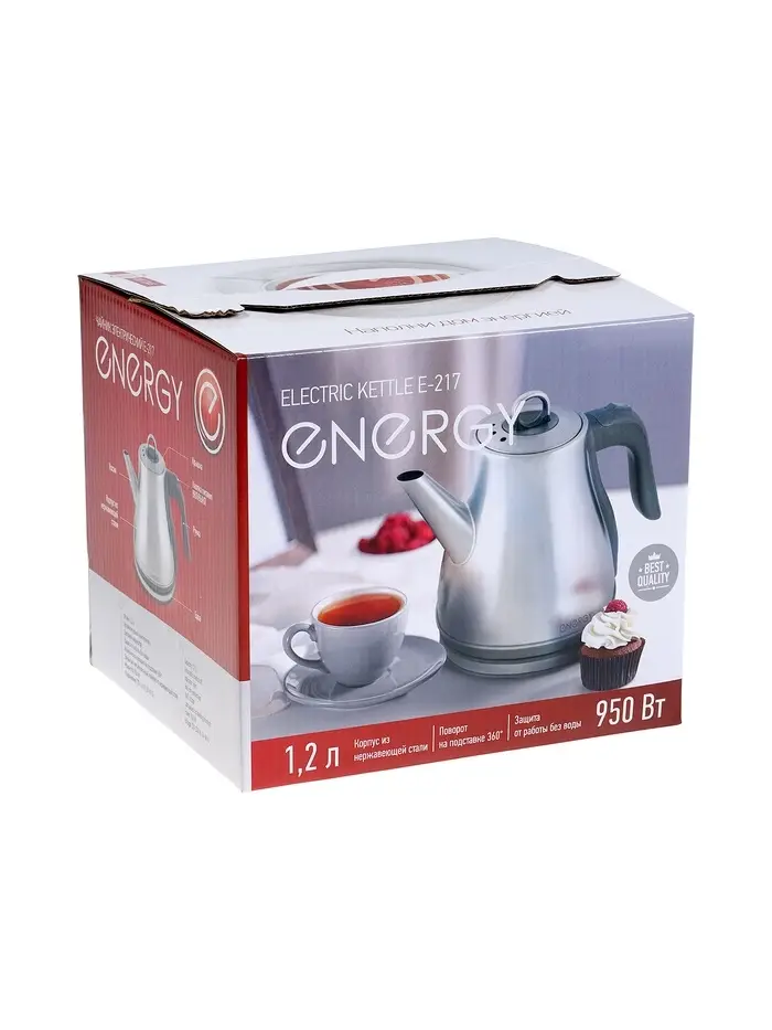 Чайник электрический Energy E-217, металл, 1.2 л, 950 Вт, серебристый