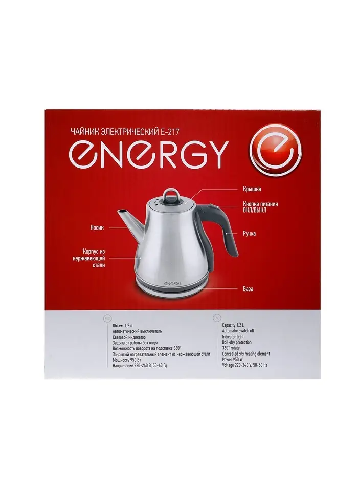 Электрический чайник Energy E-217 сочетает стильный уникальный дизайн и современные технологии. Оснащен автоматическим выключателем и функцией защиты от работы без воды, что гарантирует безопасность использования. Световой индикатор работы добавляет удобства, сигнализируя о текущем состоянии чайника. Этот элегантный и надежный прибор станет отличным дополнением вашей кухни.