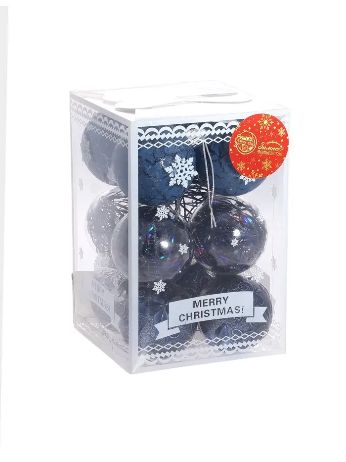 - Комплект из 12 прозрачных шаров с синим оттенком и декоративным узором.