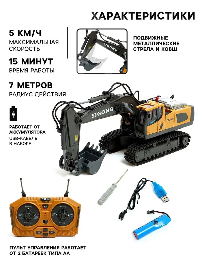 Экскаватор радиоуправляемый «Стройка», металлический ковш, работает от аккумулятора