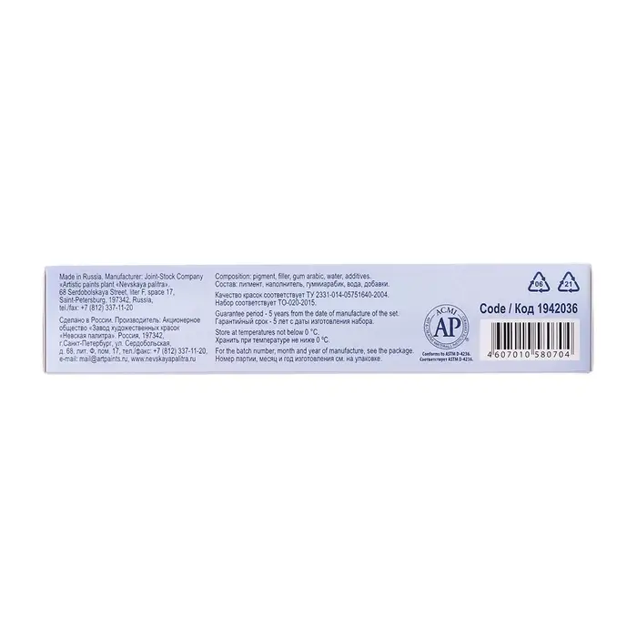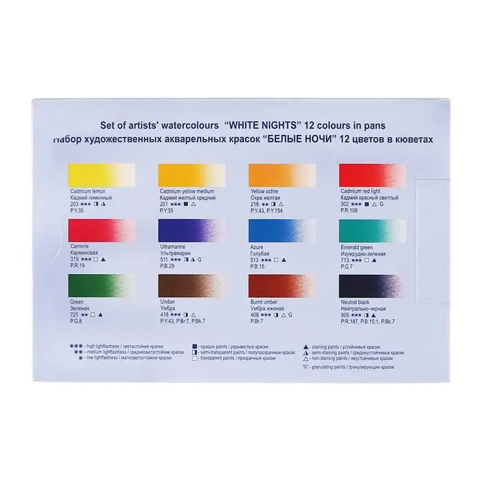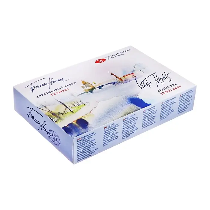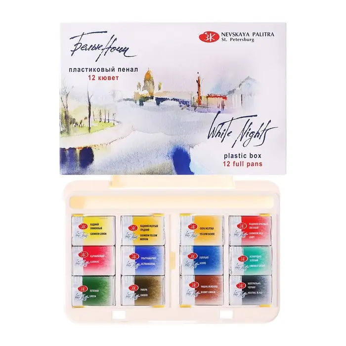 Профессиональные художественные акварельные краски "Белые ночи" представляют собой тонкодисперсные суспензии пигментов и наполнителей в связующем, в состав которого входит водный раствор растительного клея – гуммиарабика. Все акварельные краски в палитре "Белые ночи" безопасны, сертифицированы и соответствуют стандартам ASTM D-4236. Высокая концентрация пигмента обеспечивают максимальную интенсивность цветового тона акварели. Насыщенность сохраняется даже при разбавлении большим количеством воды. Отличаются прозрачностью, что дает возможность художнику работать тонкими лессировками. Чистые цвета позволяют писать в смесях и получать богатое многообразие оттенков. Основная часть красок обладает высочайшим показателем светостойкости, что способствует сохранности работ свыше 100 лет. Все это обеспечивает их высокое качество и возможность использования в ответственных работах. Сбалансированная палитра набора акварельных красок "Белые ночи" в пластиковом пенале состоит из 12 основных цветов, необходимых художнику в студии и на пленэре.