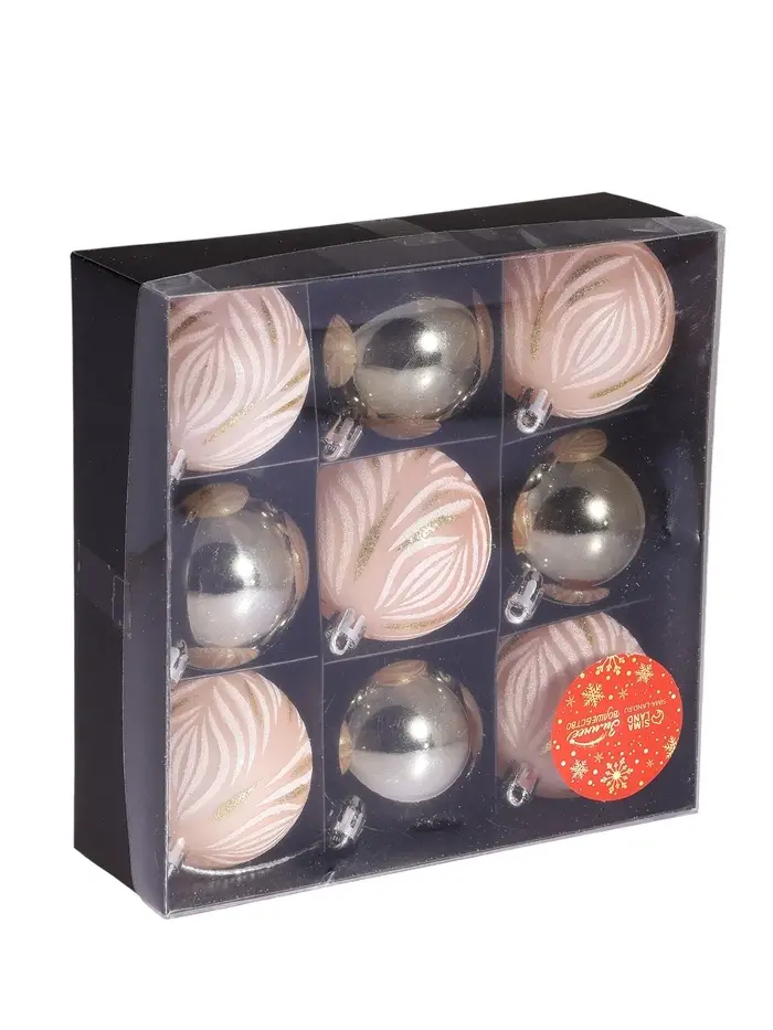 - Комплект из 9 шаров диаметром 5,5 см с декоративным рисунком.