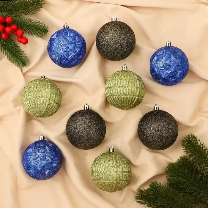 Набор из 9 ёлочных шаров диаметром 7,5 см выполнен в стиле фьюжн с рисунком и сочетает зелёные и синие оттенки. Пластиковые украшения гармонично впишутся в современный новогодний декор, добавляя глубину и динамику праздничной атмосфере.