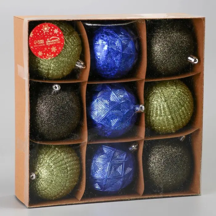 - Комплект из 9 шаров с выразительным узором и матовой текстурой.