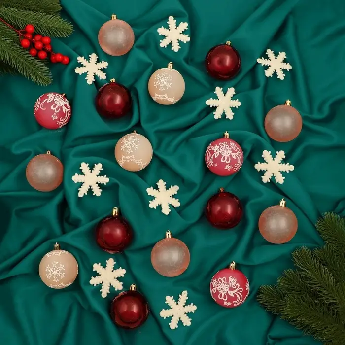 Набор из 40 пластиковых шаров диаметром 6 см с изображениями снежинок выполнен в скандинавском стиле. Такие украшения создают атмосферу зимней свежести и минимализма, подчёркивая естественную красоту новогодней ёлки.