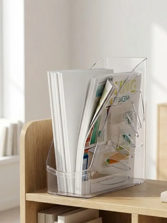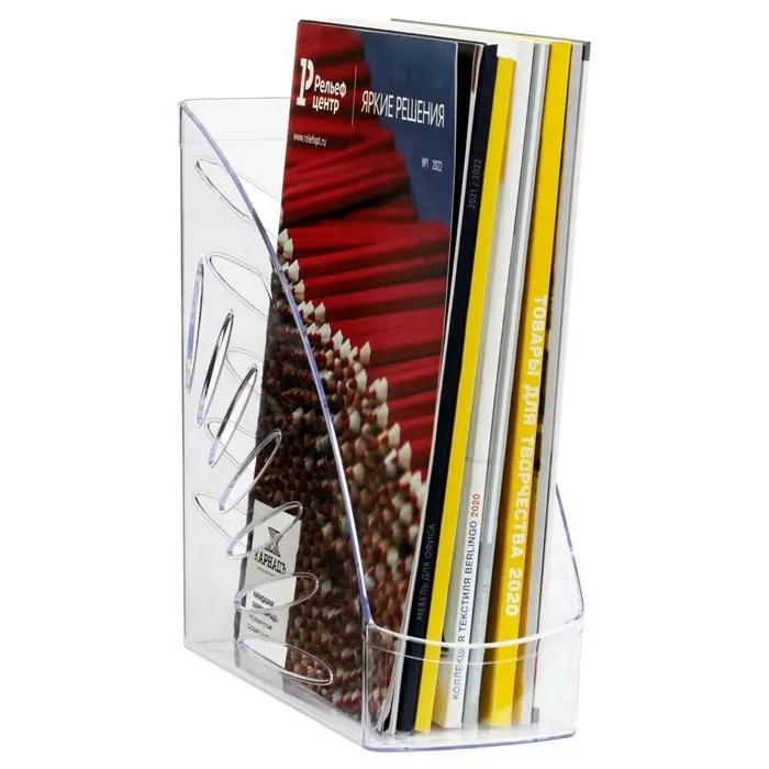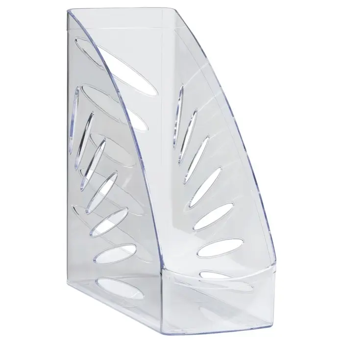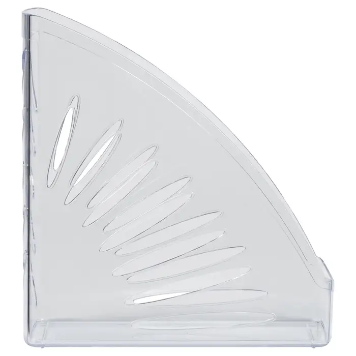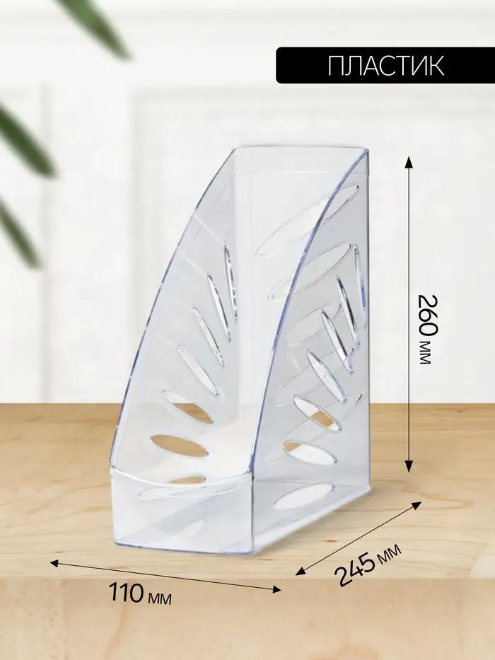 Лоток для бумаг вертикальный предназначен для хранения документов формата А4. Оригинальный дизайн. Устойчивый, вместительный и прочный корпус лотка изготовлен из качественного полистирола. Вмещает до 900 листов. Размеры изделия - 260 х 245 х110 мм. Индивидуальная упаковка - пакет. Цвет лотка - прозрачный.