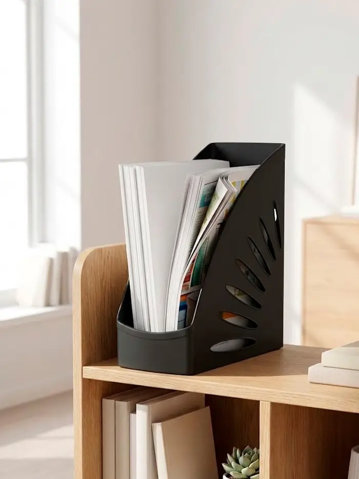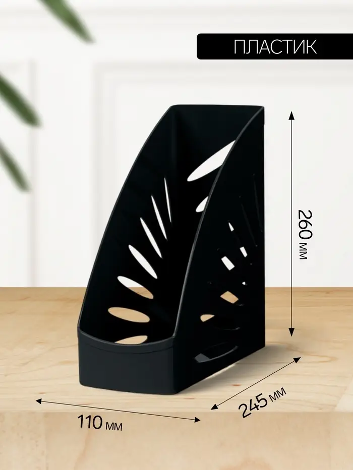 Лоток для бумаг вертикальный предназначен для хранения документов формата А4. Оригинальный дизайн. Устойчивый, вместительный и прочный корпус лотка изготовлен из качественного полистирола. Вмещает до 900 листов. Размеры изделия - 260 х 245 х 110 мм. Индивидуальная упаковка - пакет. Цвет лотка - чёрный.