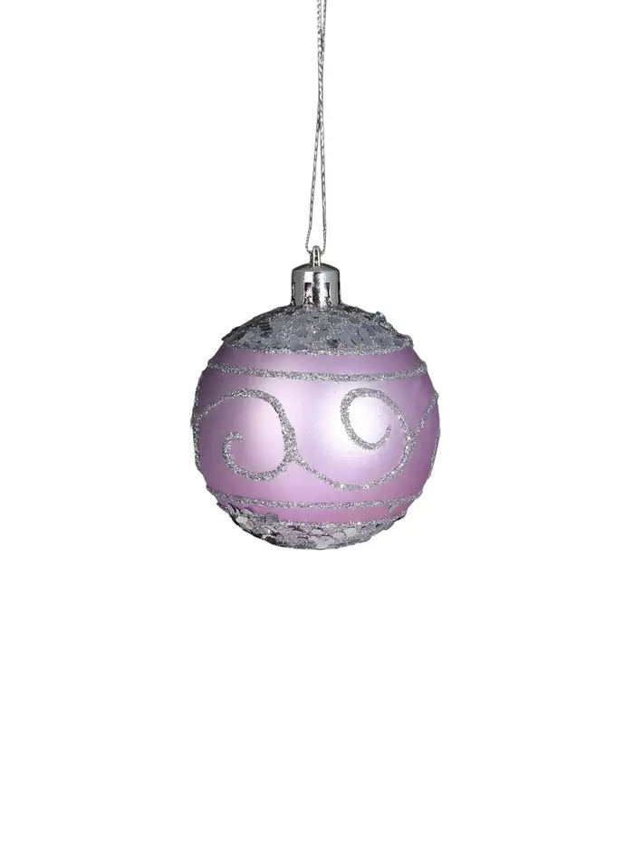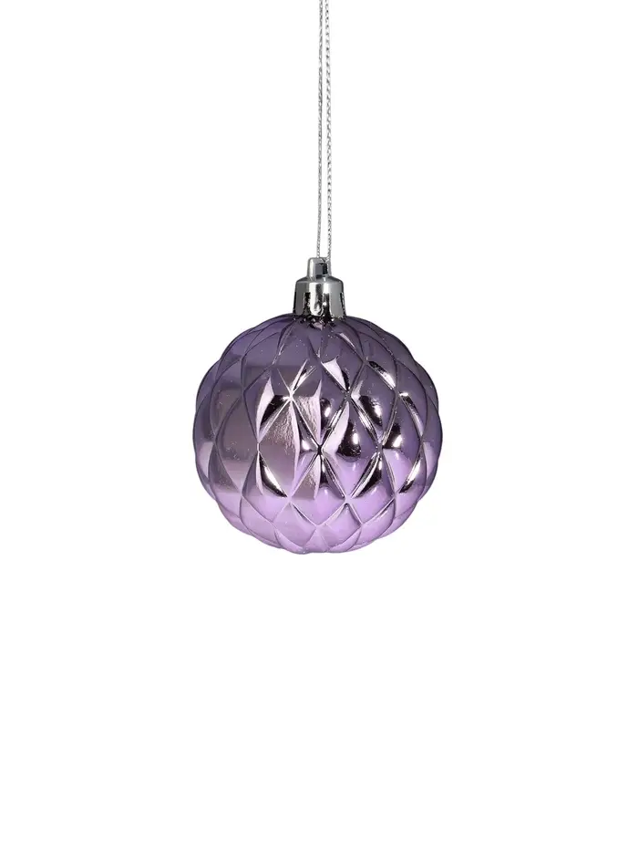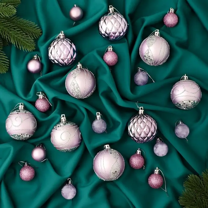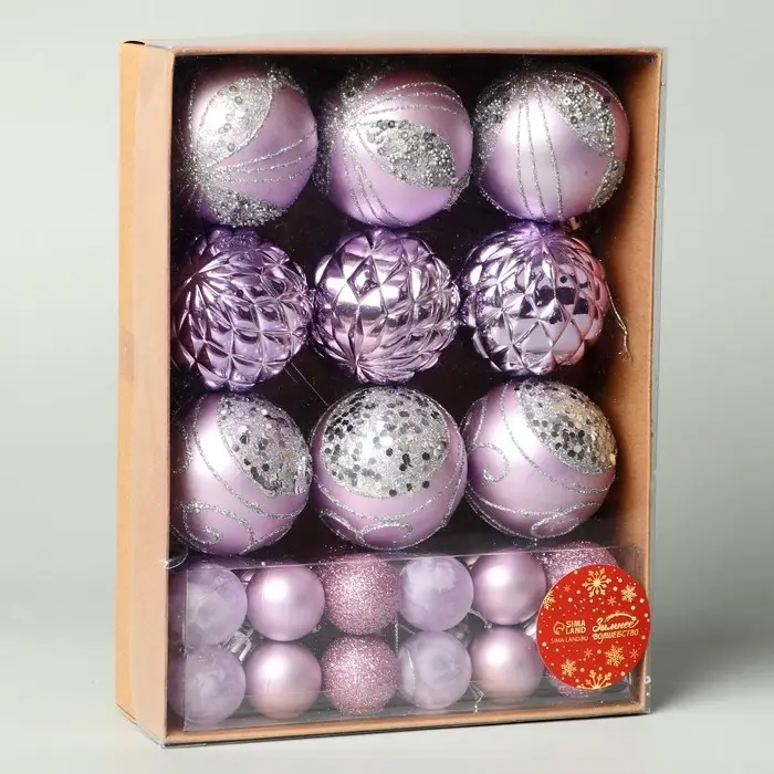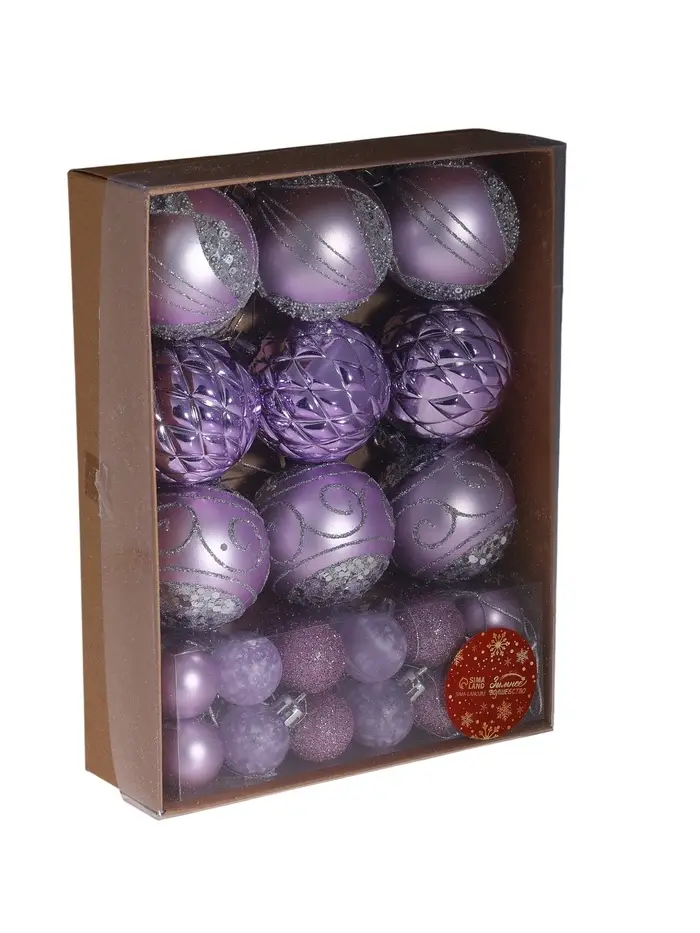 Набор из 33 сиреневых ёлочных шаров разных размеров объединяет элементы шебби-шик с изящными рисунками, создавая нежный и уютный образ праздничного декора. Разнообразие диаметров помогает сформировать многослойное оформление, подчёркивающее стиль и атмосферу новогоднего торжества.