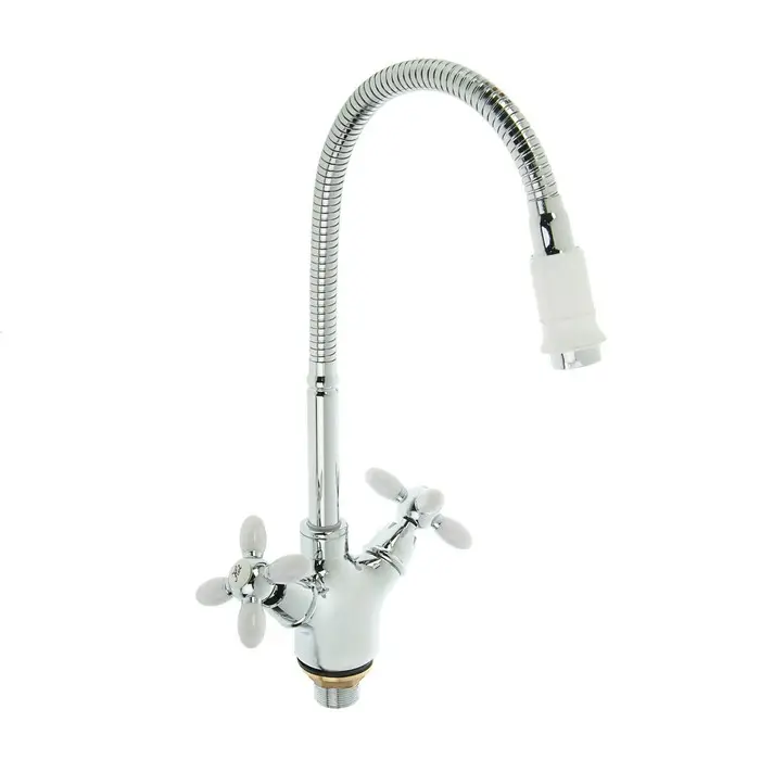 Смеситель Accoona A4882G оснащён длинным гибким изливом, положение которого вы можете менять в зависимости от желания. Также он имеет 2 маховика в форме креста и кран-буксы. Деталь выполнена из силумина.